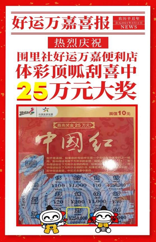 便利店里的幸运,不仅于此。就在一个多月前的3月11日凌晨,同样是一家“不打烊”的便利店,厦门市好运万嘉围里便利店中出一张25万元的顶呱刮即开票。据店员回忆称,是三位来厦门旅游的游客,在便利店消费时,随手购买了三张顶呱刮,其中一人喜中一等奖,奖金总额为25万元。