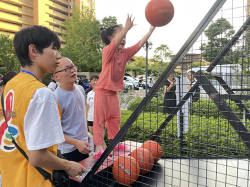 7月24日一大早,武汉体彩工作人员便来到该小区活动场地,顶着烈日布置现场,随着游戏区设备一一搭建完毕,就有围观已久的居民们迫不及待上场体验。下午17时,活动正式开始,工作人员向居民发放“体彩,不止运动”活动小手册,手册含有活动介绍以及游戏集章卡。游戏区设了5轮游戏挑战,包括“欢乐投篮机”、“眼疾手快”、“穿越火线”、“足球九宫格”、“愤怒的小鸟”等,项目丰富有趣,互动参与性强,居民按规则完成游戏挑战后,将由工作人员在集章卡对应区盖上通关印章一枚。好玩有趣的同时,大家凭通关印章还可以兑换丰富的礼品!“欢乐投篮机”是孩子们的焦点,一些身高还够不着投篮机的小朋友,被父母亲托举起来投篮,亲子协作一幕暖意融融。“眼疾手快”更是反应力大考验,需要快速接住空中掉落的塑胶棒,大朋友们玩得不亦乐乎。“穿越火线”则是难度最大的游戏关卡,专注度、手脑协调缺一不可。每项游戏都排着长长的队伍,居民们耐心等待有序参与。很多居民通关兑换到礼品后很开心,立马在业主群内分享喜悦,告诉熟悉的邻居好友们赶紧来现场参与闯关。活动现场热闹非常,吸引社区居民们走出家门参加活动,在运动中体会乐趣,在运动中结交朋友,增进亲子、邻里关系。
