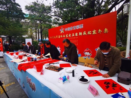 传统与现代两种风格融为一体的背景板、写有“公益体彩 乐善人生”“国家公益彩票”的彩旗、呼应冰雪运动的拍照框,更把现场装点得精神抖擞。功勋教练和体育冠军与艺术名家、市民群众们畅谈北京冬奥,分享自己与体育的不解之缘,祝福北京冬奥成功主办。艺术名家挥毫泼墨,创作围绕冬奥主题赠送给功勋教练和体育冠军,用书画艺术创作为北京冬奥会喝彩。