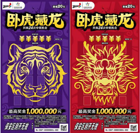 本次上市的“卧虎藏龙”主题即开套票,共有5元、10元、20元三种面值。票面设计色彩浓郁、霸气美观,“虎头”、“龙头”标识跃然于票面正中,“眼神”犀利且极富“挑战”意味,寓意充满自信,敢于挑战最高奖金。