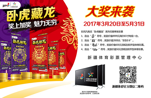顶呱刮家族票“卧虎藏龙”将于3月20日在新疆各体彩网点上市销售。新疆体彩为回馈广大购彩者对即开型体育彩票“顶呱刮”的关注和支持,对在新疆范围内授权销售的面额5元、10元、20元“卧虎藏龙”主题即开型体育彩票开展“卧虎藏龙 奖上加奖 魅力无穷”全区统一营销活动:2017年3月20日至2017年5月31日,凡购买家族票“卧虎藏龙”面值5元、10元、20元系列的即开型体育彩票的购彩者,
