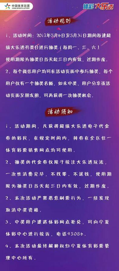 1、关注“宁夏体彩”微信公众号,回复关键字“大乐透”或点击底部菜单“免费代金券”即可进入抽奖界面;
