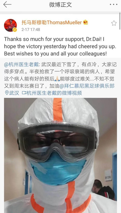 戴一帆收获的第一份惊喜,是在驰援武汉一周后的2月16日。在进隔离病区前,戴一帆穿着防护服自拍了一段“希望一切平安,武汉早日恢复正常,大家加油”的视频。他将视频上传到自己的微博上。没想到,在当晚比赛结束后,拜仁俱乐部和托马斯·穆勒都在微博上回应了戴一帆,并为他以及其他医护人员送上祝福。