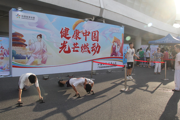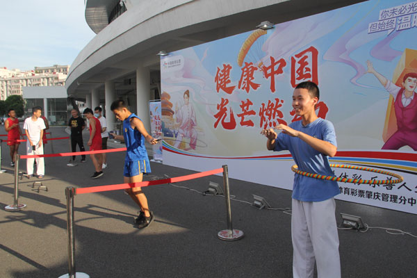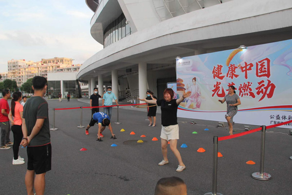在第12个“全民健身日”到来之前,7月11日,肇庆体彩中心结合“点亮健康中国”活动,在肇庆市体育中心组织开展“健康中国 光芒燃动”为主题的点亮健康中国暨公益体彩宣传和即开票推广活动。