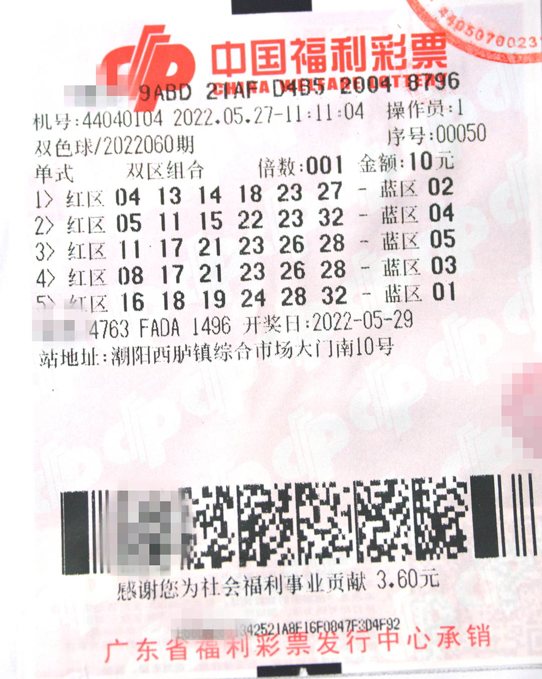 5月29日晚,中国福利彩票“双色球”游戏第2022060期开奖,本期双色球全国开出3注一等奖,单注奖金高达1000万元,其中广东中出1注,花落汕头市潮阳区西胪镇综合市场大门南10号第44040104号销售网点。