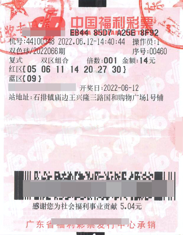 6月12日,双色球第2022066期开奖。经检索,广东省中出4注一等奖,其中1注花落东莞市石排镇44100348销售网点,中奖彩票是一张14元1倍复式7+1自选票,中得总奖金5170928元。