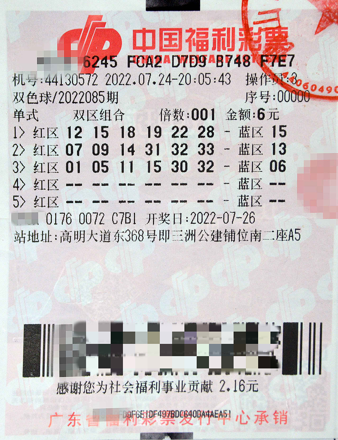 2022年7月26日晚,双色球第2022085期开奖,当期全国共中出12注一等奖,单注奖金6387330元,其中1注花落佛山。经检索,中奖彩票是一张1倍3注机选单式彩票,投注金额6元,出票时间为7月24日20点05分。