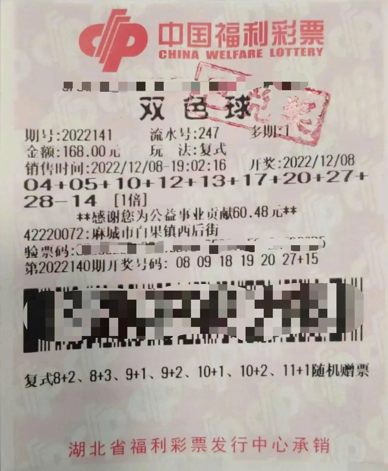 12月8日晚,福彩双色球第2022141期开出05、12、13、17、20、27+14的大奖号。湖北省黄冈麻城市一购彩者,凭借一张9+1的复式票,斩获一等奖1注、一等奖特别奖1注,总奖金达781万元。
