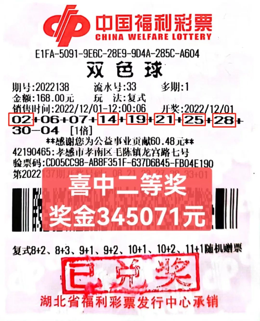 原来,前一天晚上开奖的福彩双色球2022138期,该站彩友自组的合买中了二等奖,奖金34万多元,这些彩友是过来兑奖的。