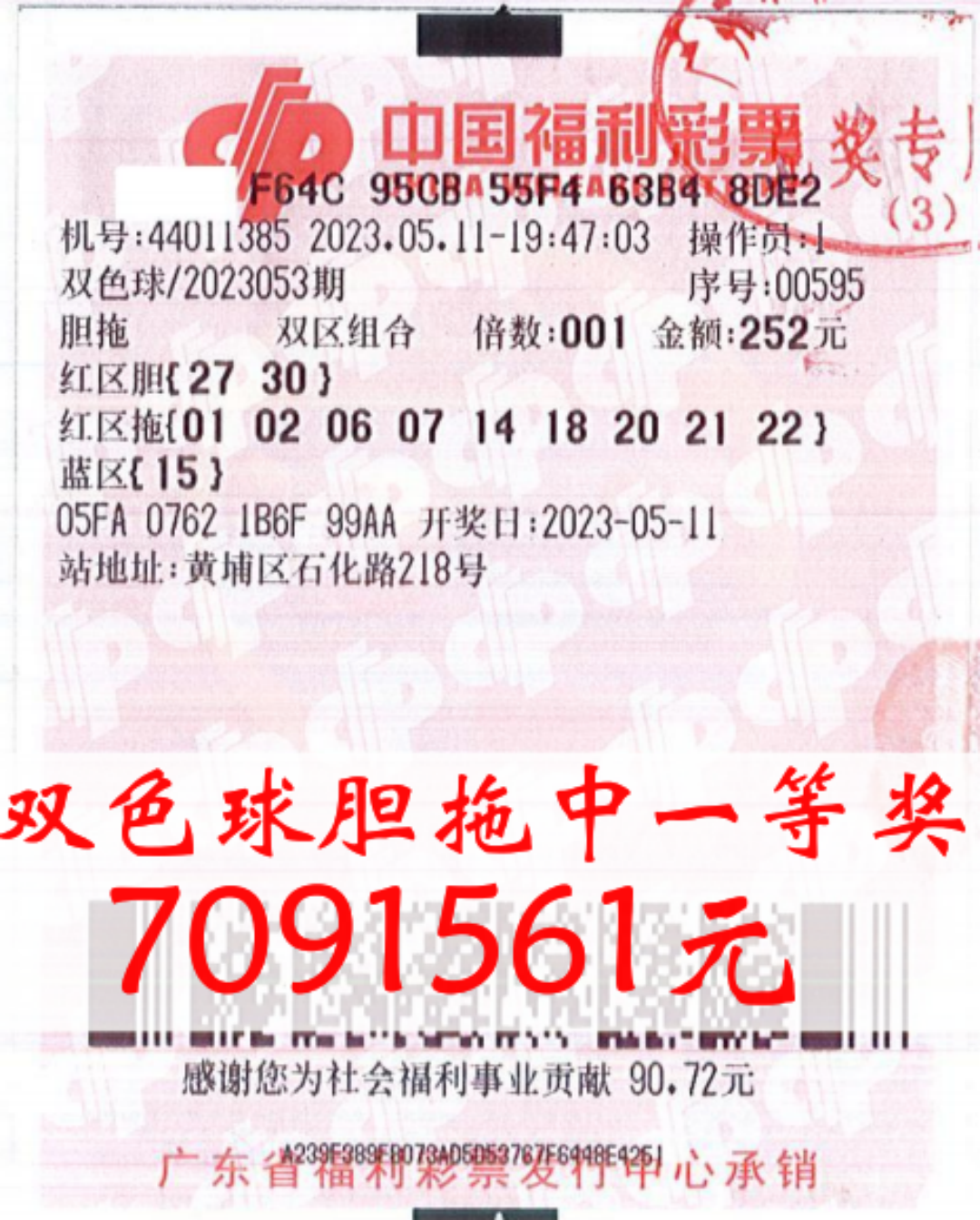 近日,福彩双色球2023053期开奖,当晚全国中出10注701万元的一等奖,其中一注头奖花落广州市黄埔区石化路218号44011385投注站,据检索,中奖彩票为一张252元的胆拖自选票。这是广州市彩民今年收获的第4注双色球一等奖。
